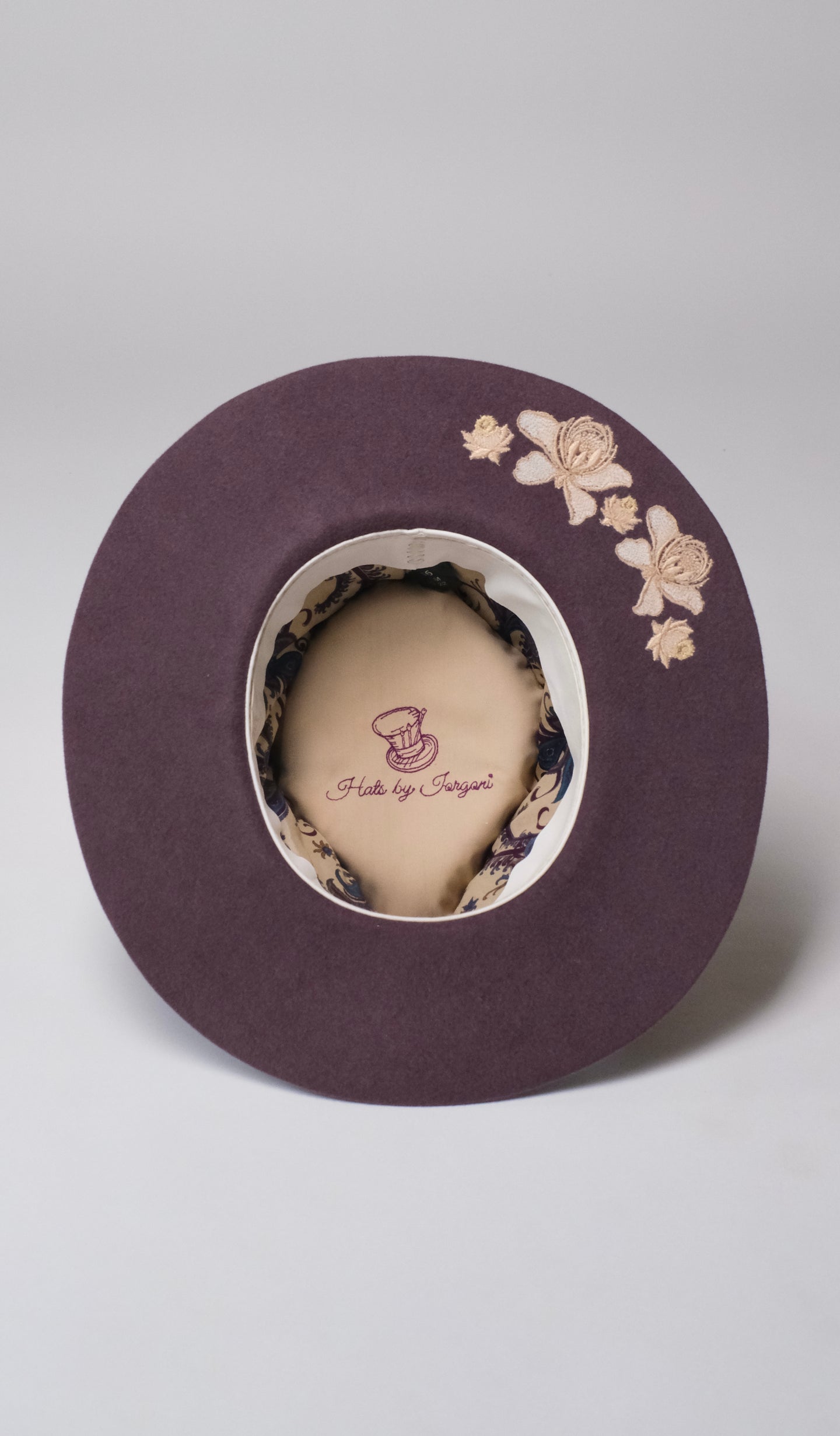 Confecționată din fetru 100% păr de iepure, pălăria are boruri de 7 cm și o calotă cu înălțimea de 12 cm în punctul maxim.