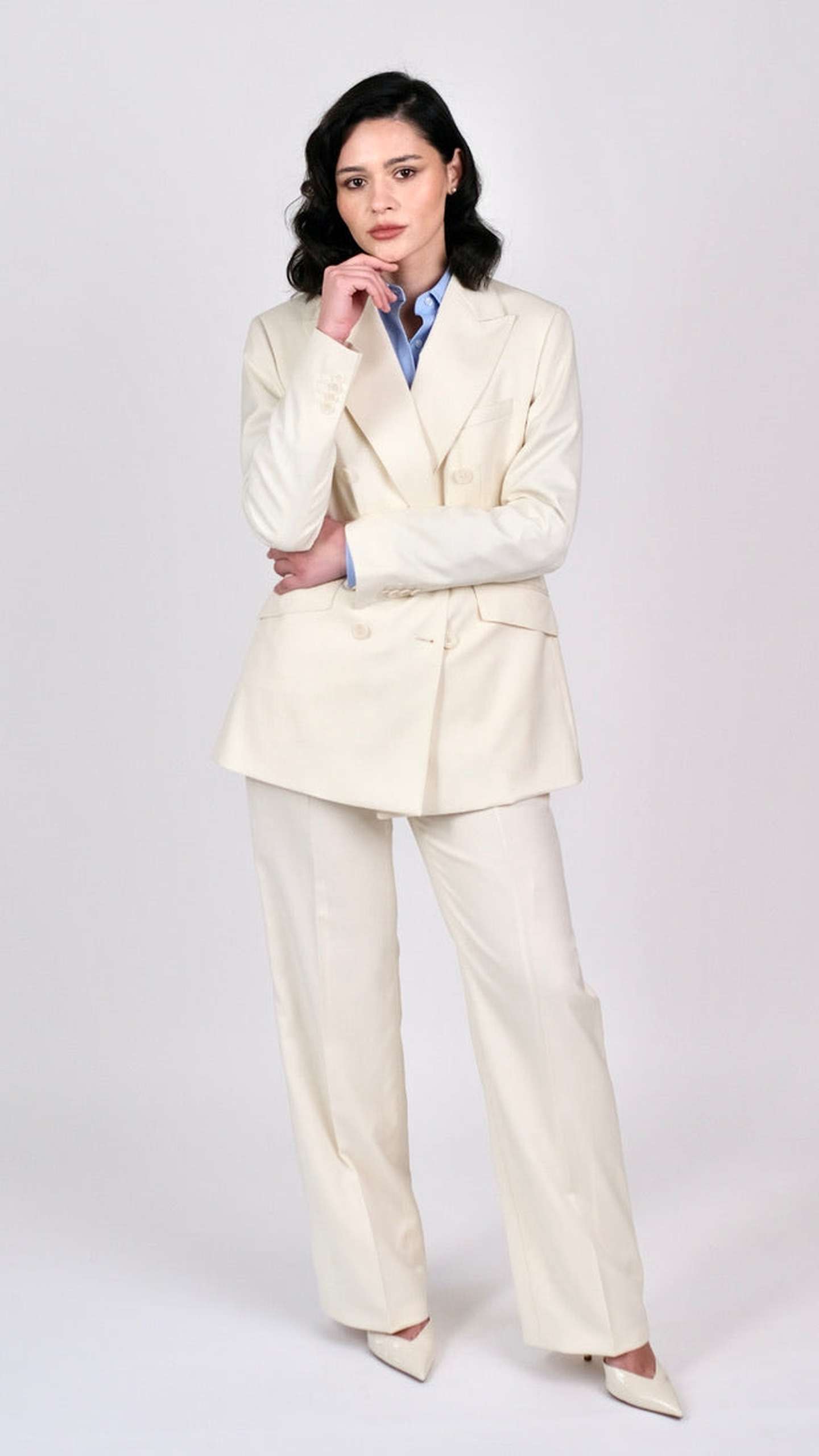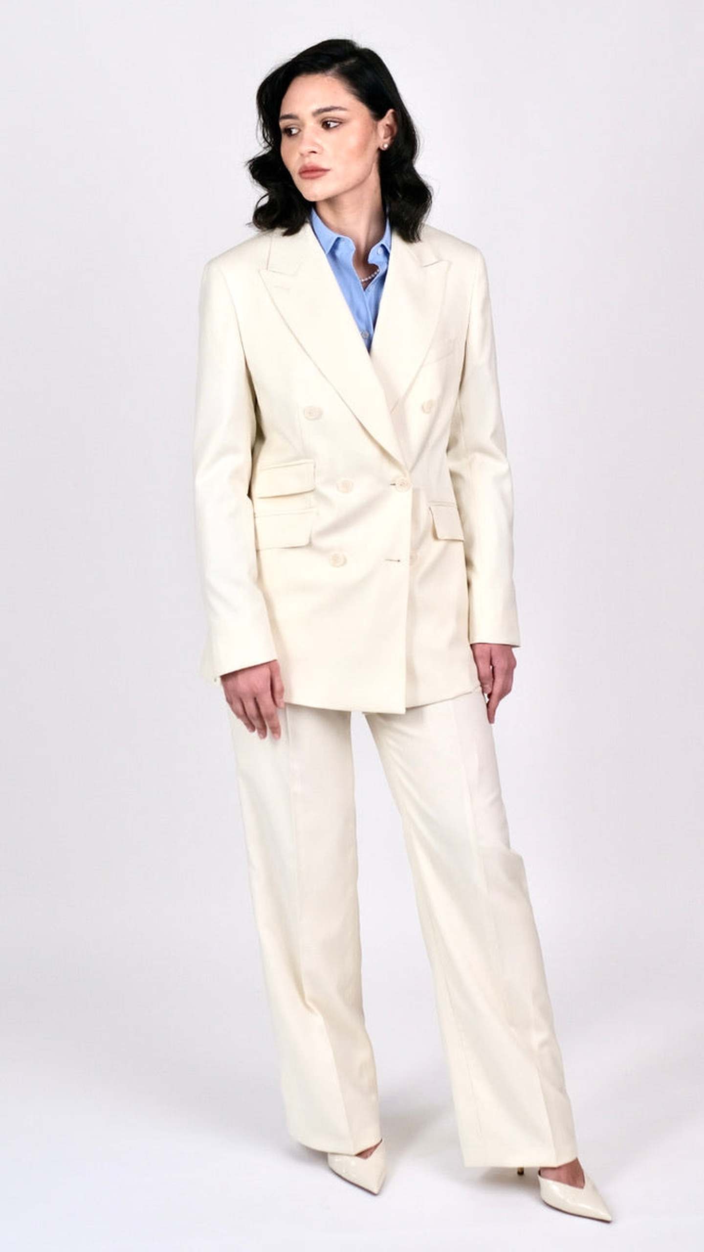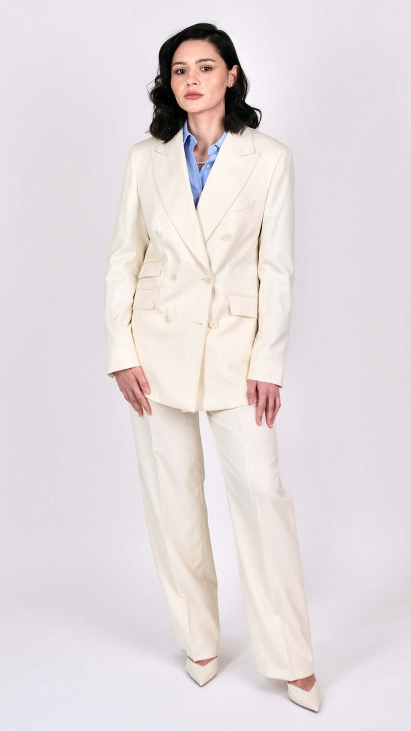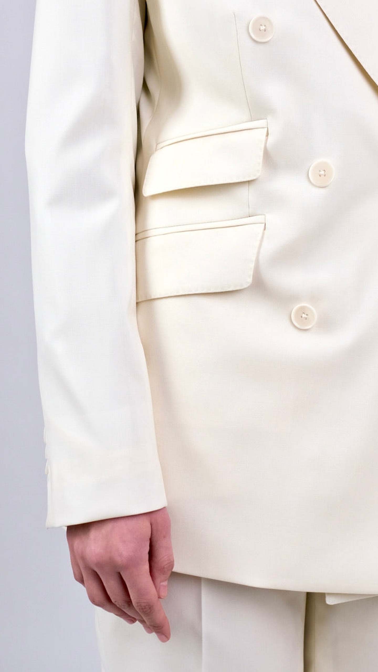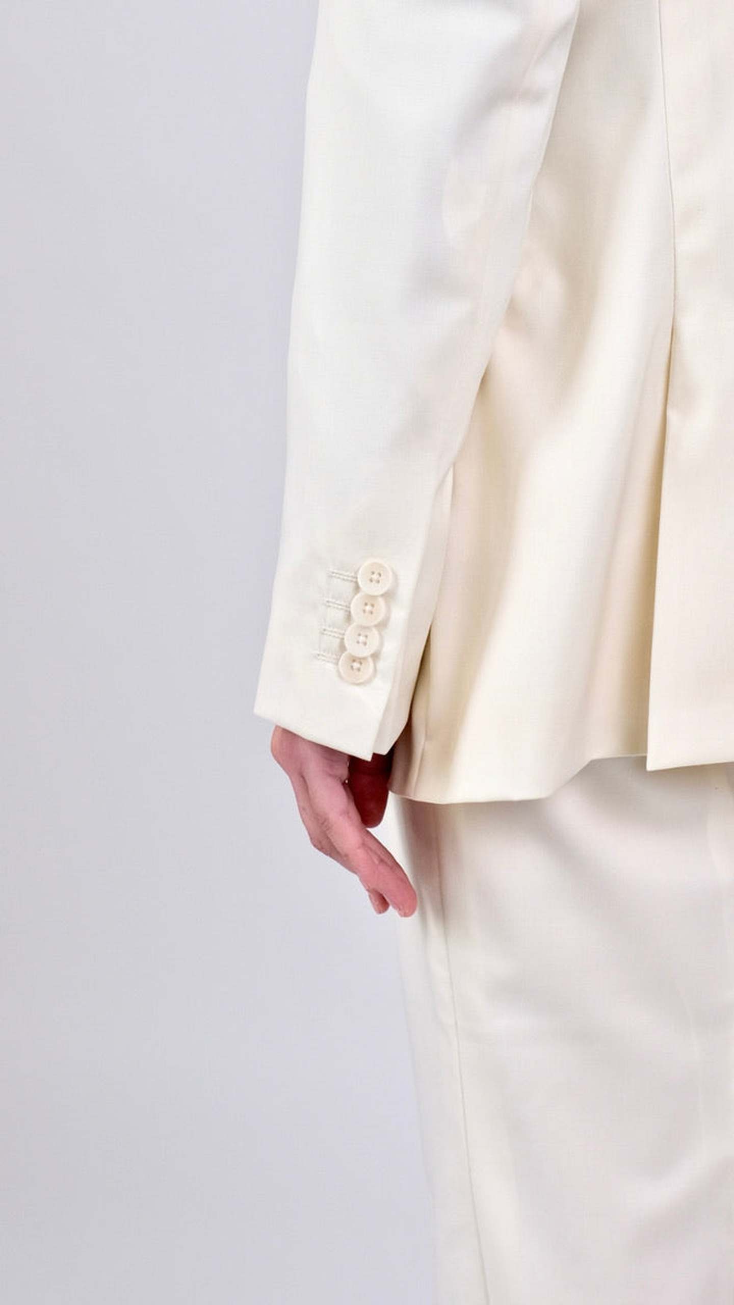 Acest costum compus din două piese include un sacou bej realizat din 100% lână de finețe 120S, cu închidere la două rânduri de nasturi, buzunare cu clape și revere de 10 cm ascuțite. La nivelul acestora se regăsește o cusătură ornamentală de tip AMF.