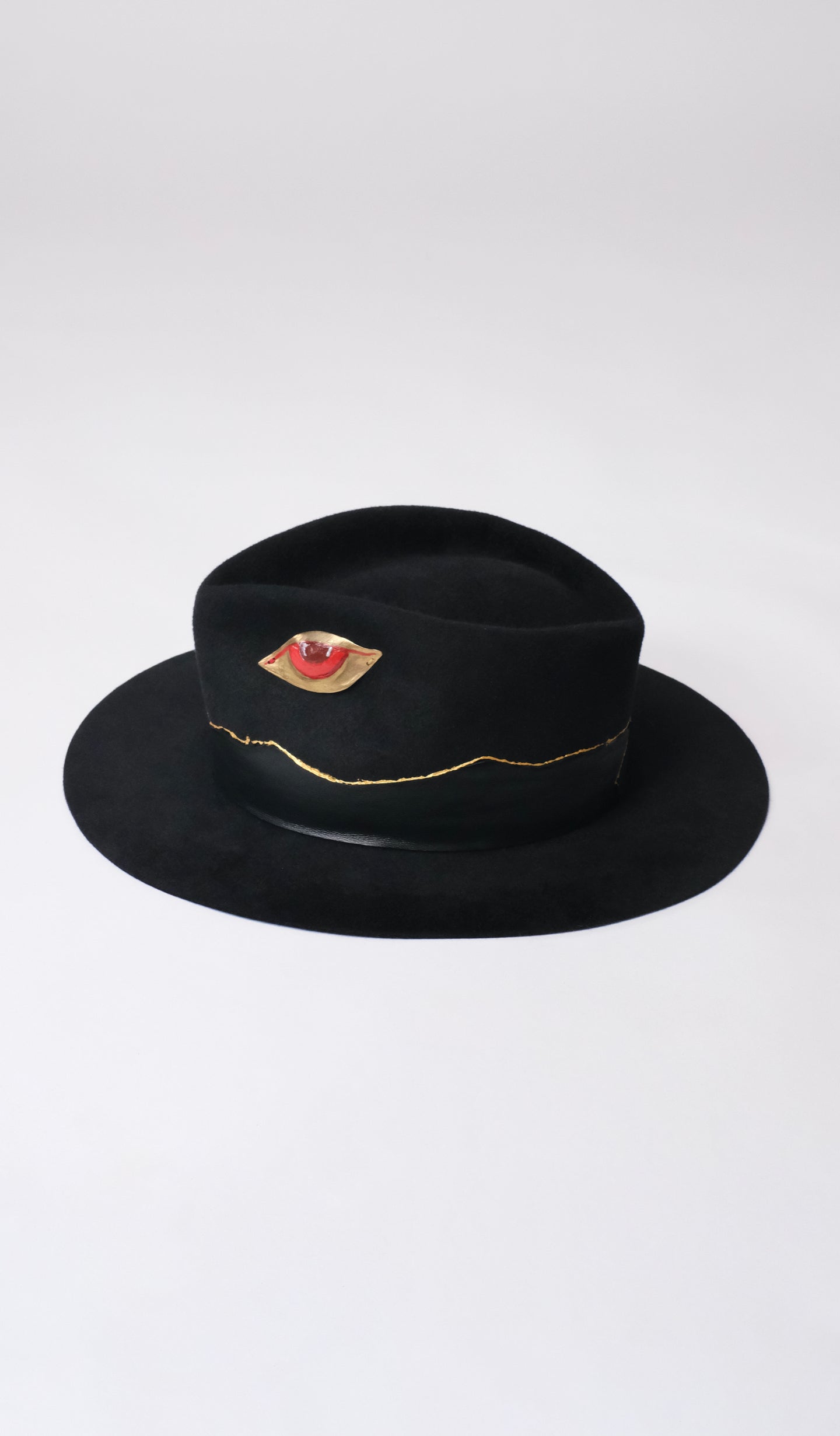 Elementul central — ochiul sculptat în alamă și pictat manual — adaugă un aer misterios și simbolic. Interiorul este finisat cu mătase naturală și bandă de piele, pentru confort și rafinament.